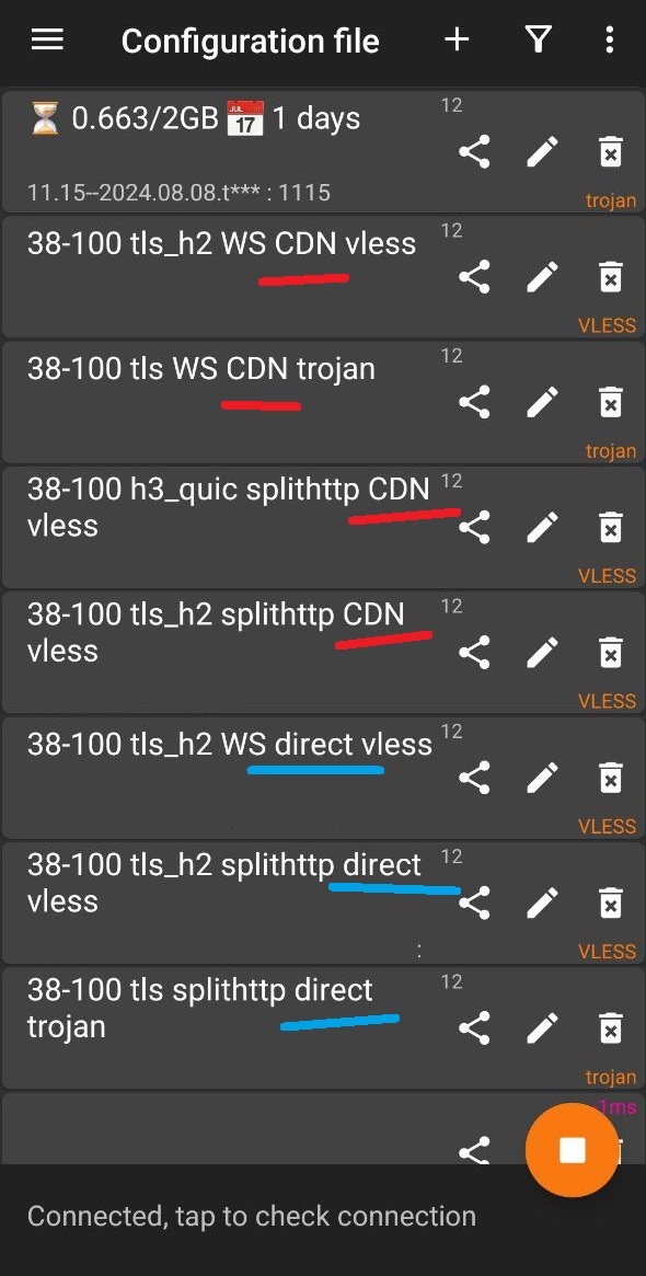 اطلاعیه 25 خرداد 1404: کانفیگ های CDN برای حل مشکل همراه اول به روز رسانی شدند در صورت عدم اتصال لطفا داخل برنامه وی پی ان خود از طریق دکمه به روز رسانی اشتراک (Update Subscription) لینک های اتصال خود را به روز رسانی نمائید. در صورت عدم انجام یا دریافت پیغام خطا، وی پی ان را قطع نموده و دوباره تلاش نمائید.